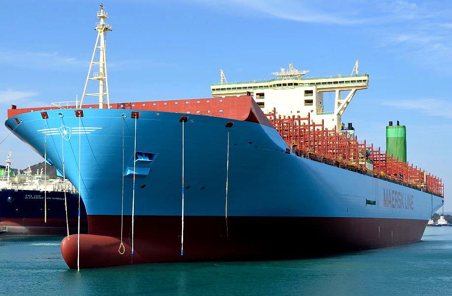 Maior navio de contentores do mundo a ser, o novo “Maersk Mc-Kinney Møller” da Maersk está actualmente passando por testes no mar. É a primeira de novas embarcações da empresa “Triple E-Class”, com 18 mil TEU e está definido para ser o maior cargueiro do mundo em serviço. Está para ser entregue no dia 28 de Junho.